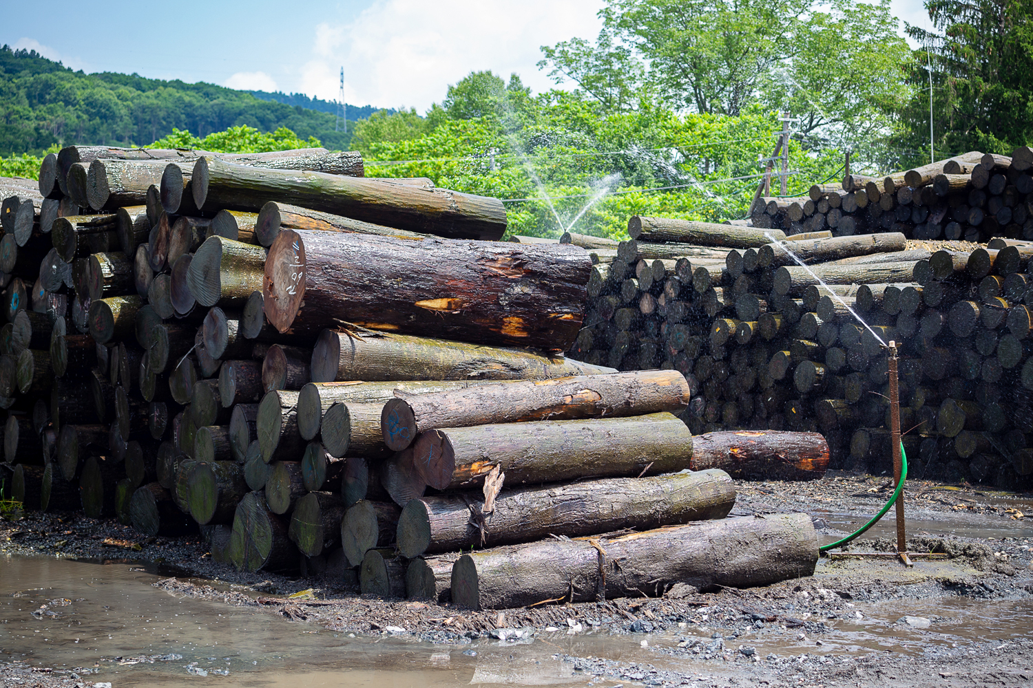 本社工場横に保管される原材料の丸太。夏場は水をかけて温度を下げる