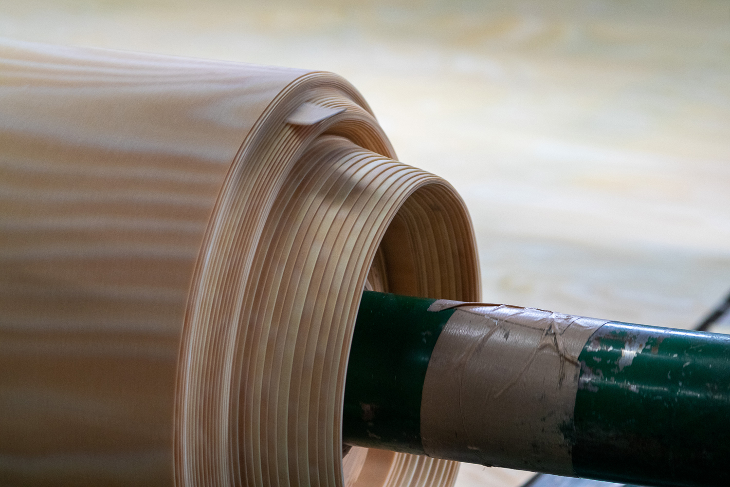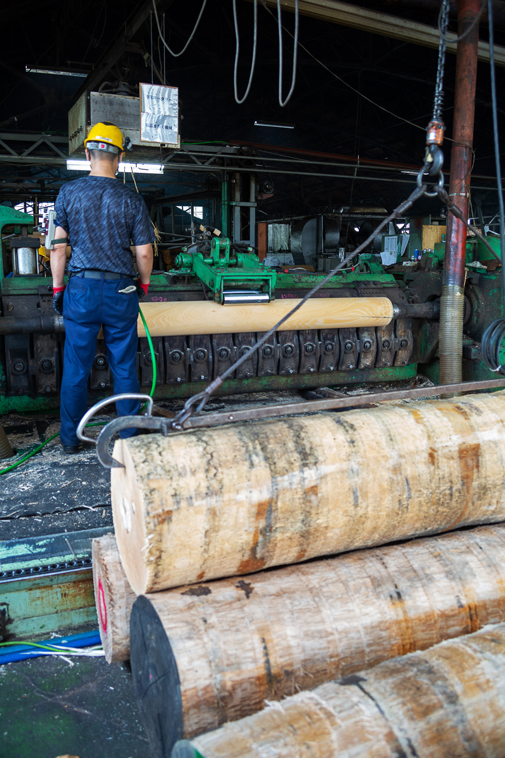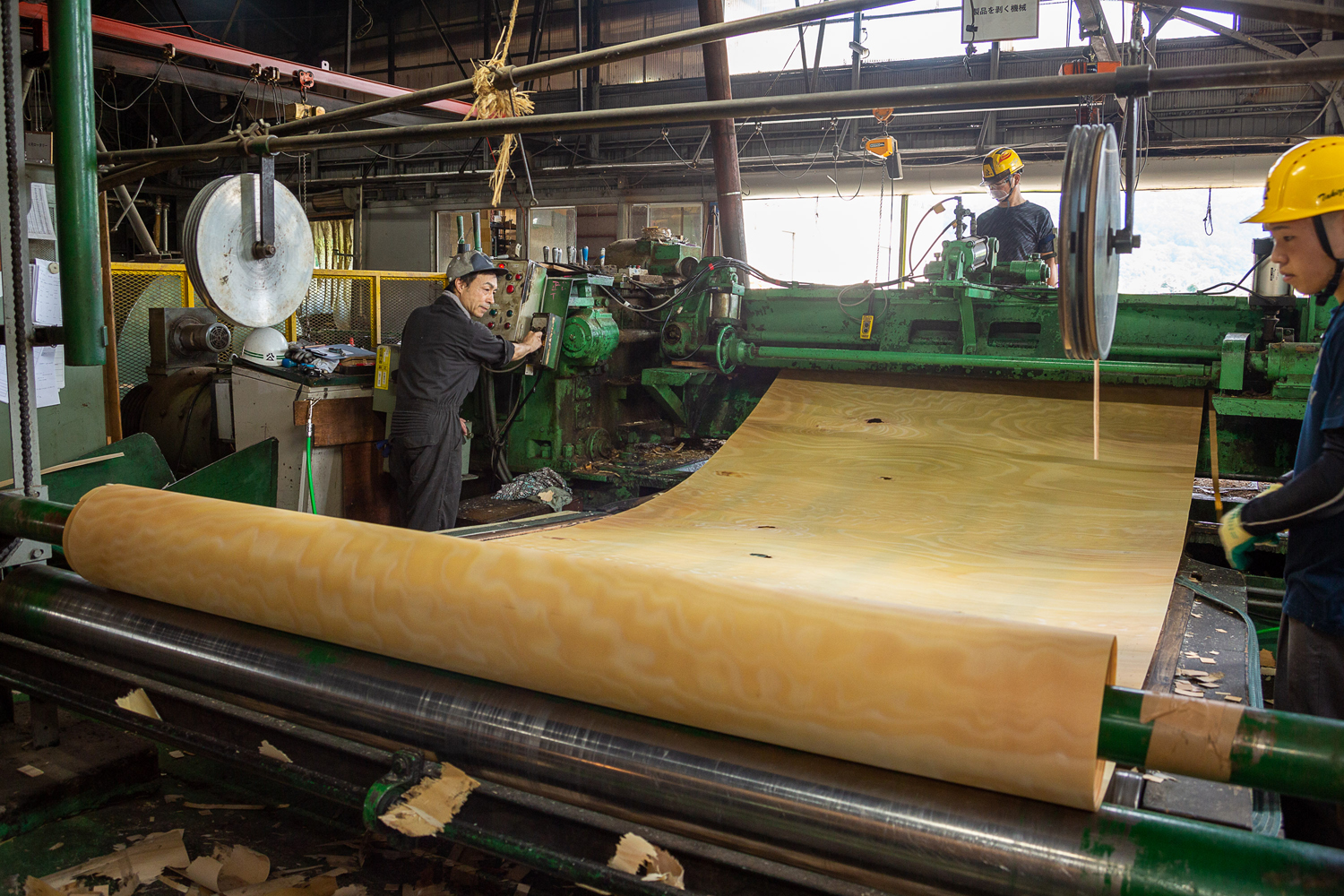滝澤ベニヤ株式会社の本社工場にて。シナやシラカバなど広葉樹の丸太をロータリーレースという機械で薄く剥いでいく。これを何層にも貼り合わせ、家具や内装建材などに使う合板にする