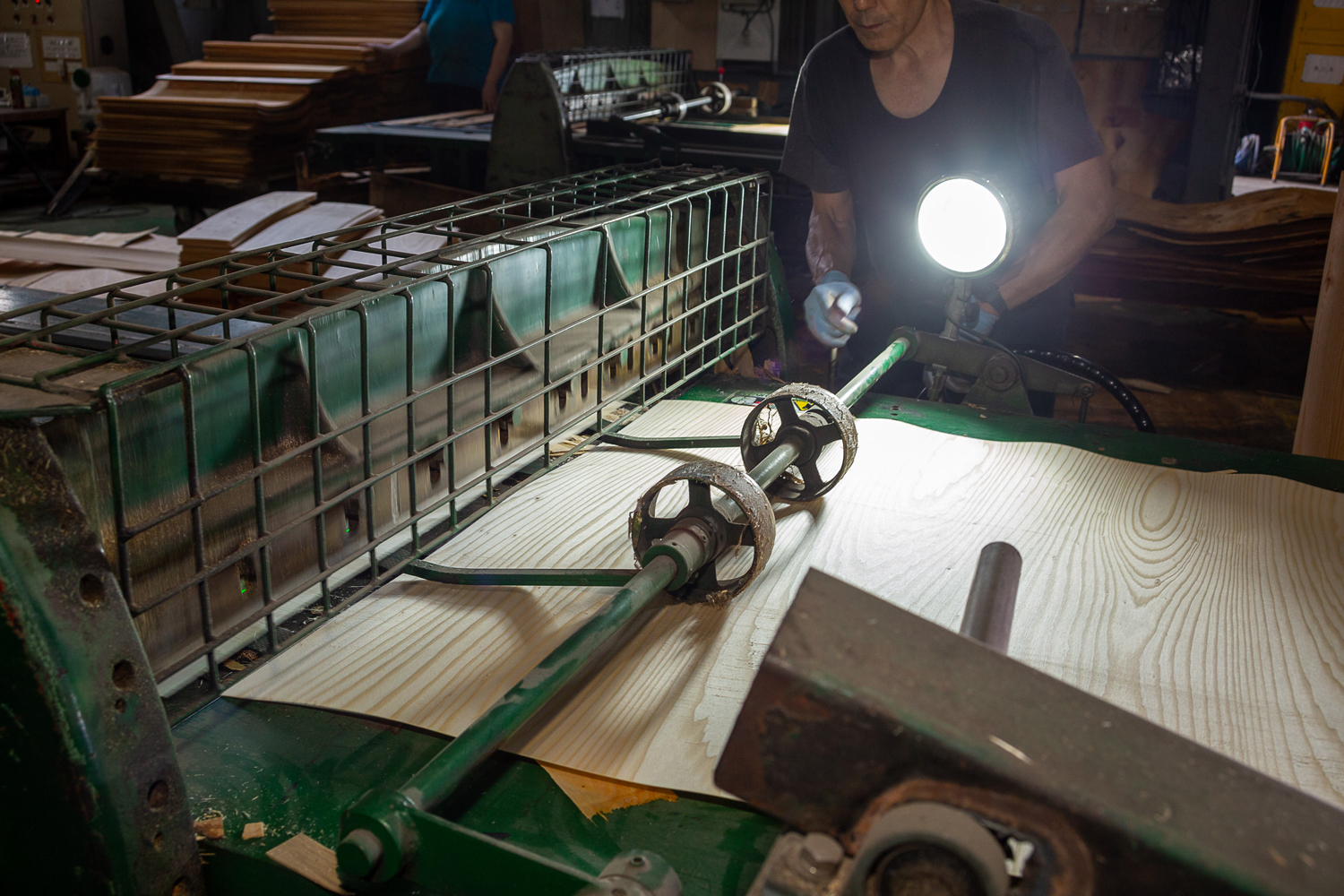 たとえばペーパーウッドのように積層数の多い合板は、単板のわずかな厚さの違いが最終的には1ミリ以上の狂いにつながる。そのため滝澤ベニヤでは、プラスマイナス0.05ミリの精度で単板を剥き出す。剥くのは当然機械だが、それを調整する職人の感覚が大きな鍵となる。