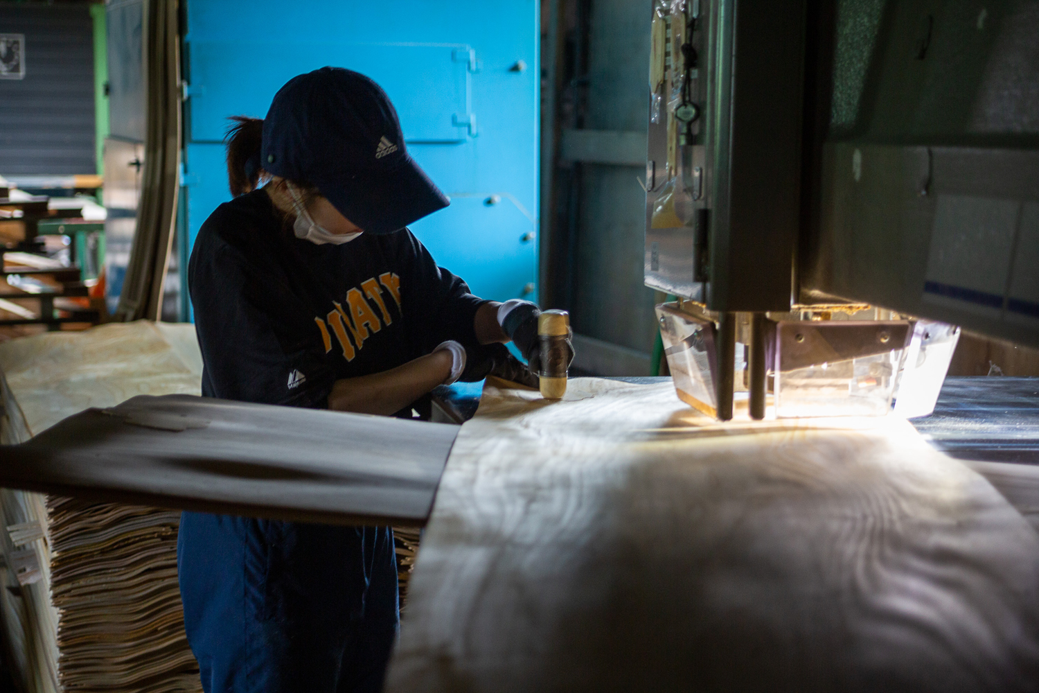 ここで基礎的な説明を少し。家具や建材などさまざまな木製品に使われる「合板(ごうはん)」は、原木の丸太を大根のかつらむきのように薄くスライスし、木の繊維が交互になるように重ね、接着剤で貼り合わせて作る。貼り合わせる前の一枚板を「単板(たんぱん)」とよぶ。