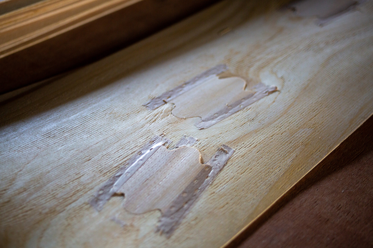 滝澤ベニヤが製品の仕上がりとして特に気をつかっているのが、合板の木口断面。単板に大きな節などがあるときは、埋め木加工を施して断面に節がでないようにしている。下は埋め木加工(パッチ修正)済みの単板
