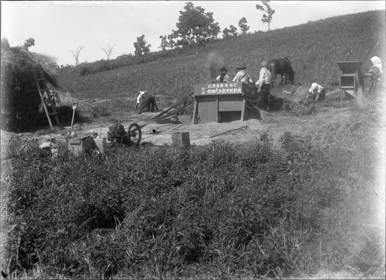 燕麦落とし(脱穀)のようす。依田式五穀脱穀機の文字が読める(年代未詳)
