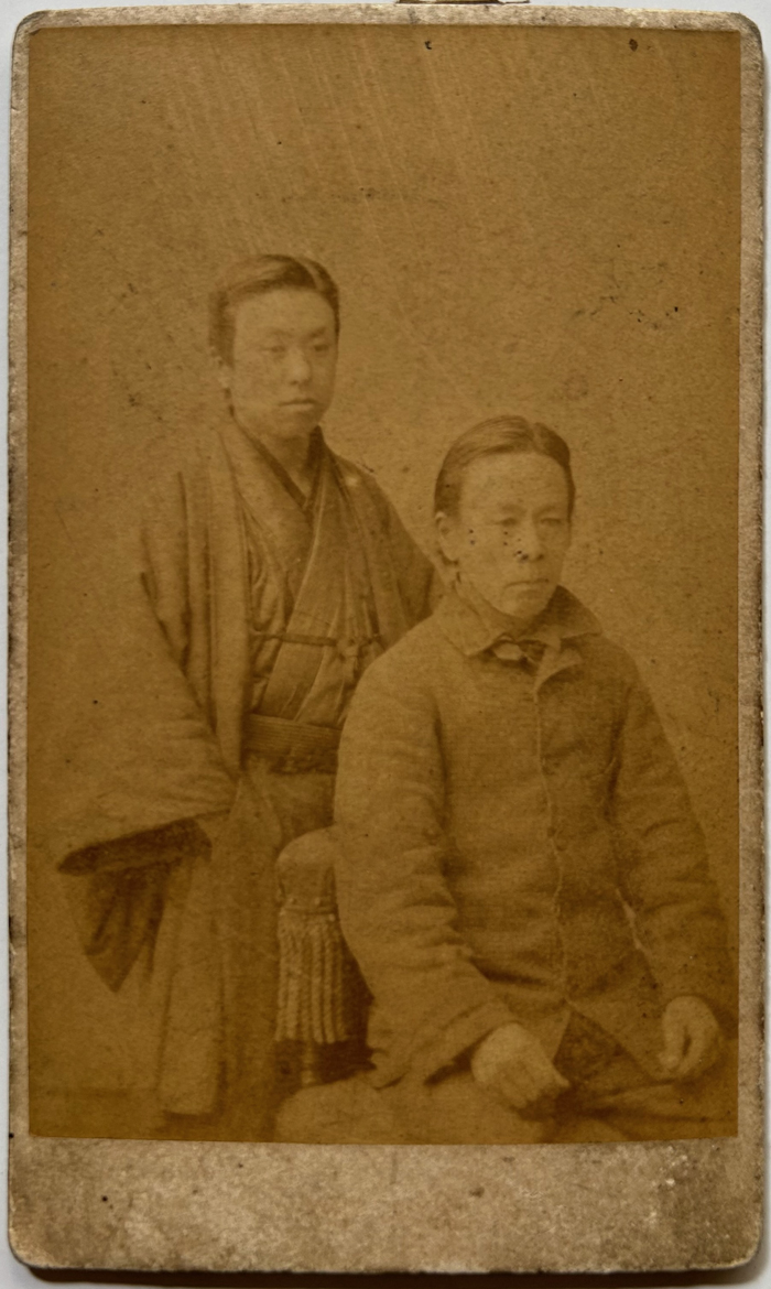 直四郎に馬追原野、次に幌向原野への入植を勧めた札幌の馬具商亀谷卯之助(右)。小説『馬追原野』では関谷宇之助として登場する。武林写真館で撮った肖像。左は亀谷政吉(卯之助との関係は未詳)。亀谷馬具商店は、南2条西1丁目角、現在の萬田記念病院の地にあった