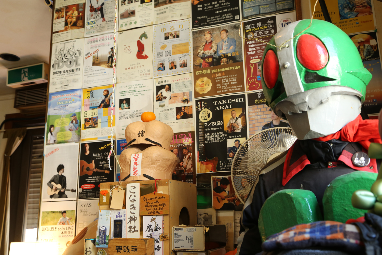 店内には「こなき神社」まで建立されている。ご夫婦のミュージシャンが、自作した“こなきじじい”の被り物でオープンマイクに登場した。フォルムのできのよさから飾っておいたらいつの間にやら「こなき神社」となり、賽銭箱まで設置されている。さらに神社を守るように仮面ライダー(これも常連客の手づくり)まで置かれ、ミュージシャンたちからも評判のスポットとなっている。壁にはライブなどのチラシが一面に貼られている