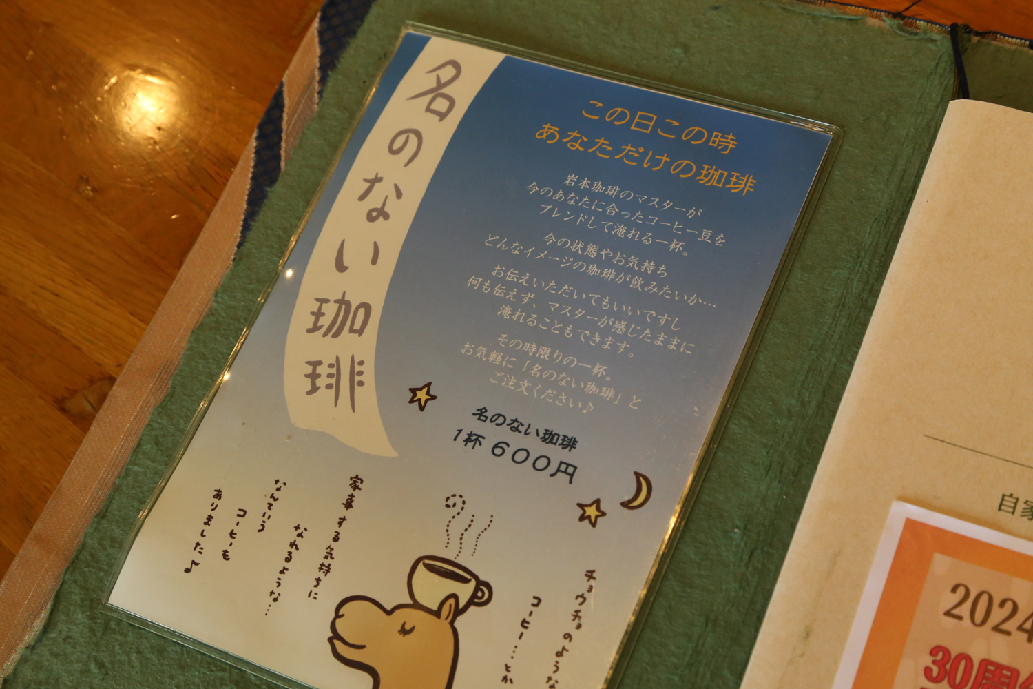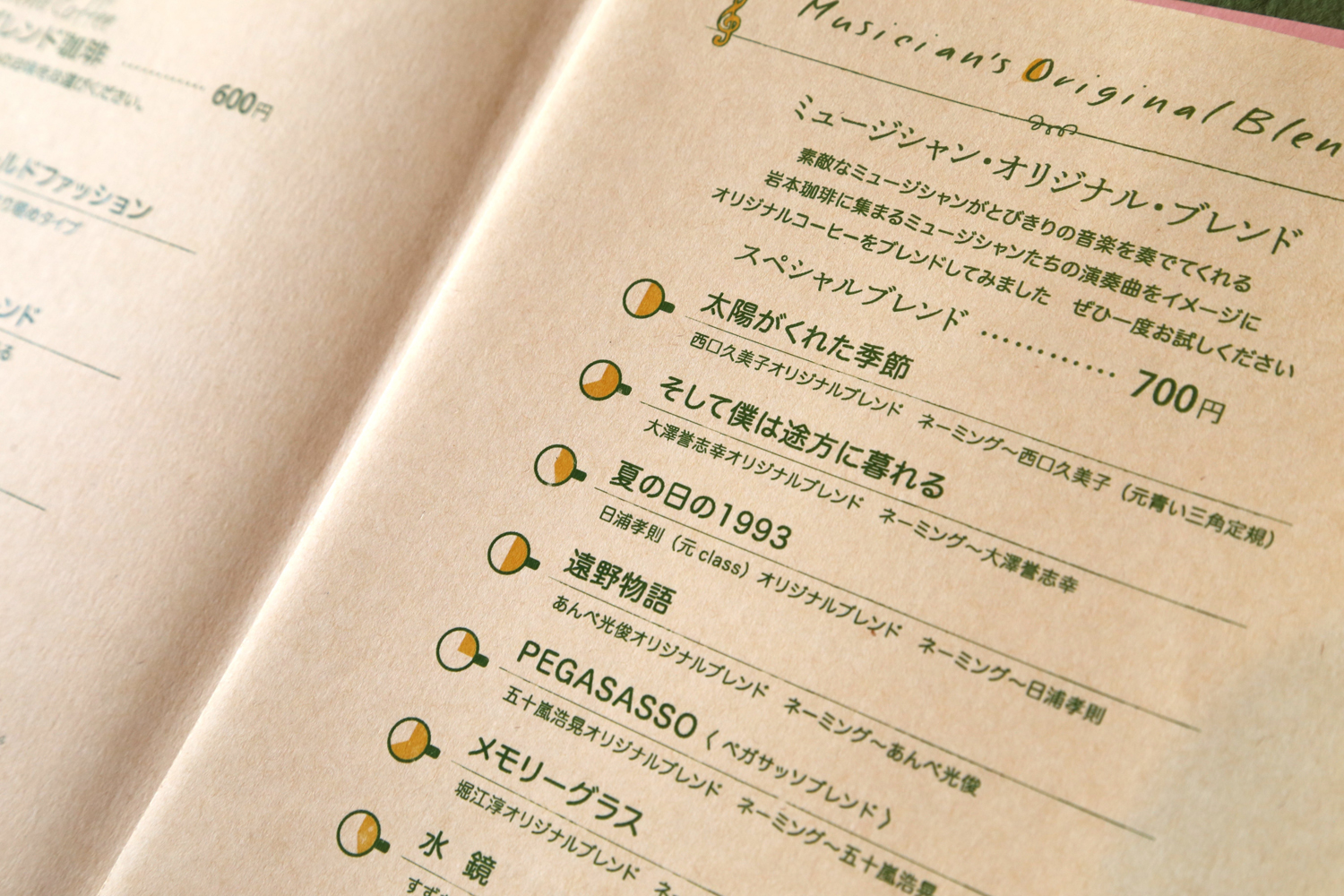 岩本珈琲のメニューには、そうした研究の成果であり店の看板である3種のブレンド珈琲の横に『ミュージシャン・オリジナル・ブレンド』なるメニューが並ぶ。ここでライブを開催したミュージシャンに許可を取り、彼らの曲のイメージに合わせたブレンドを創った。また、『名のない珈琲』は、客がこんなイメージのコーヒーを飲みたい、あるいは今の気分を伝えてそれに合ったコーヒーを、その場でブレンドして淹れてくれるものだ。こうしたブレンドの創作は、確かな知識と技術、経験がなければできるものではない。
