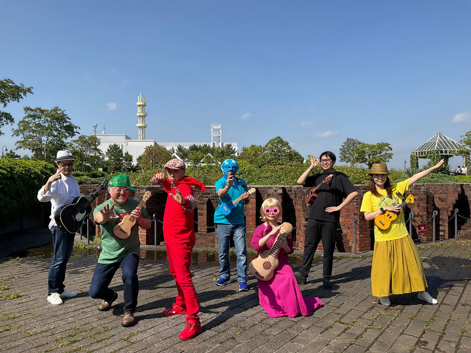 音楽に関わるようになってからウクレレの演奏を始め、「ウクレレ戦隊ウクレンジャー」を結成。2022年にはウクレレ音楽院賞も受賞している(演奏風景の映像は下から閲覧可能)。上の写真は横浜にて。赤のレンジャーが岩本さん(提供:岩本珈琲)