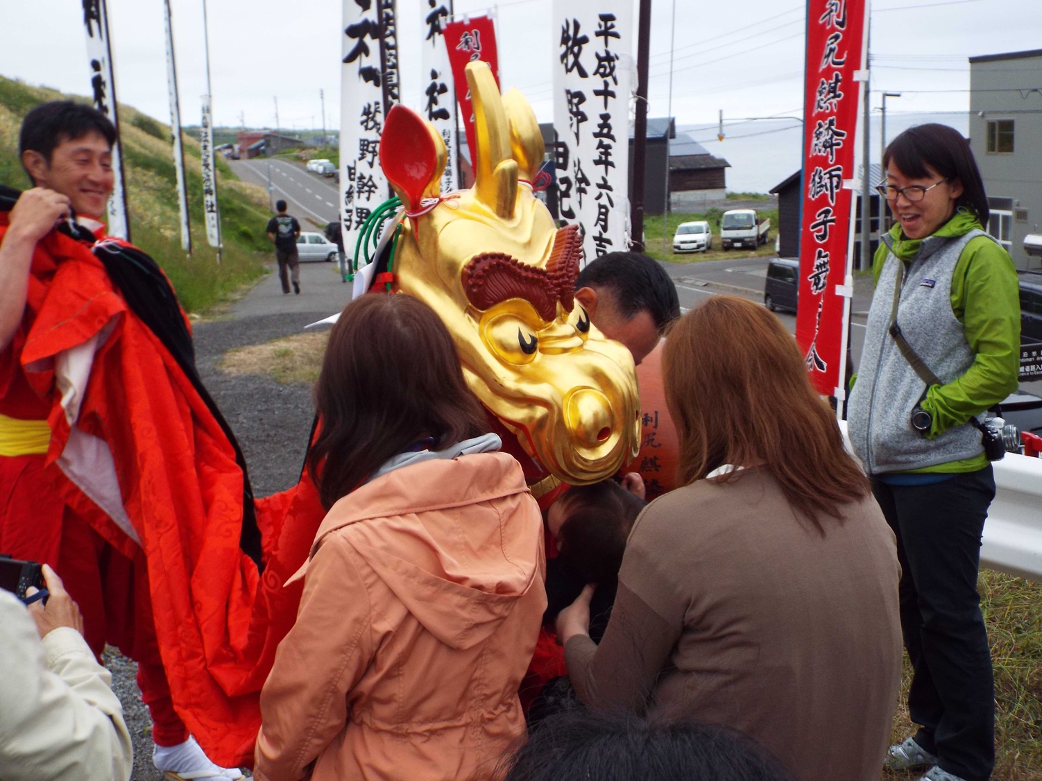 2004(平成16)年。利尻島仙法志(せんほうし)の長浜神社の宵宮祭り(6月20日)で麒麟獅子がよみがえったというニュースは、島の内外に伝わった。北海道内のメディアはもちろん、麒麟獅子のふるさと鳥取のTV番組でも紹介され、「利尻麒麟獅子舞う会」のひとりだった西谷榮治さん(当時利尻町立博物館学芸員)はいくつもの媒体に報告を寄せた。また秋に北海道開拓記念館(現・北海道博物館)で開かれた特別展「北海道の民俗芸能」には、利尻麒麟獅子の一式が展示された。さらに暮れには、麒麟獅子を舞ってみようと呼びかけて、沓形(くつがた)小学校の児童を対象に麒麟獅子舞体験を行った。舞う会のメンバーにはこの時点ですでに、島の新たな文化として、長浜の外にも積極的に知らせていこうという気持ちが強くあったのだ。