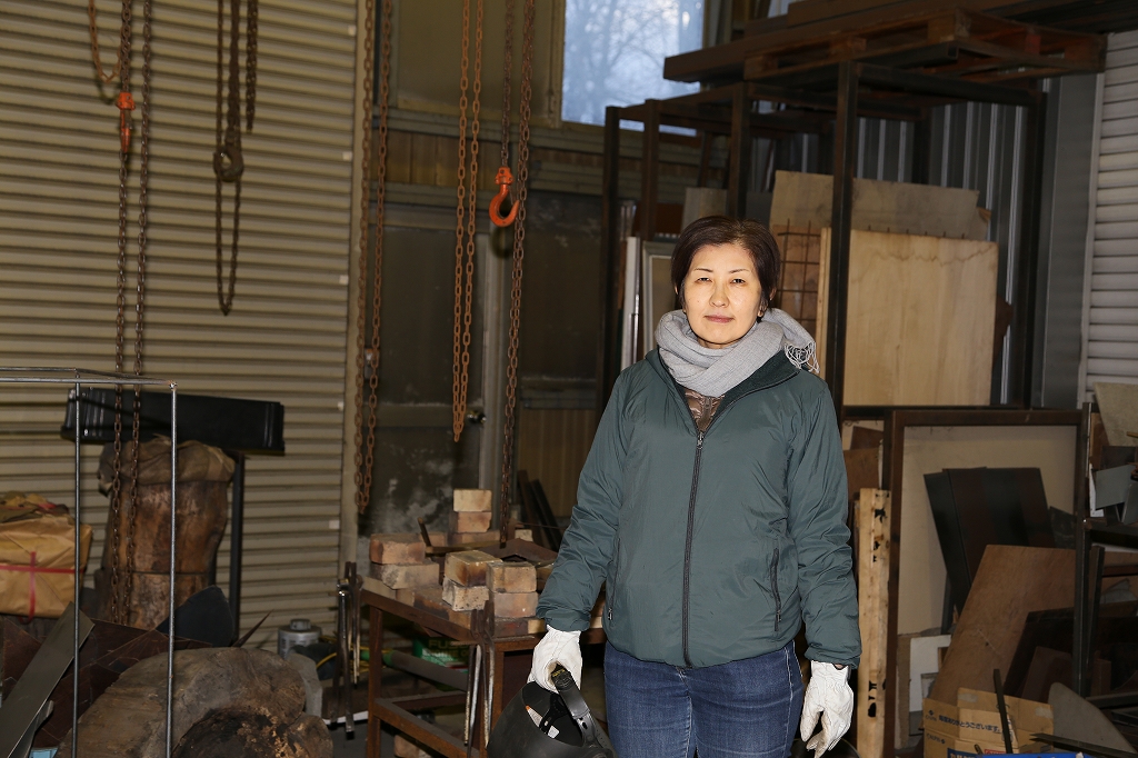 スタジオの印象は、美術家の仕事場というよりも、鉄材の切断や熔接機材が揃った工場のようだ。必要であればフォークリフトを運転し、建築現場にあるような足場も組む。「もともと男勝りな性格なので、こういった機材を使うことに、全く抵抗はない。道具も作品に合わせて作る」と、ハードな作業もどこか楽しんでいるように見える。