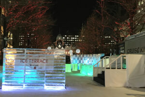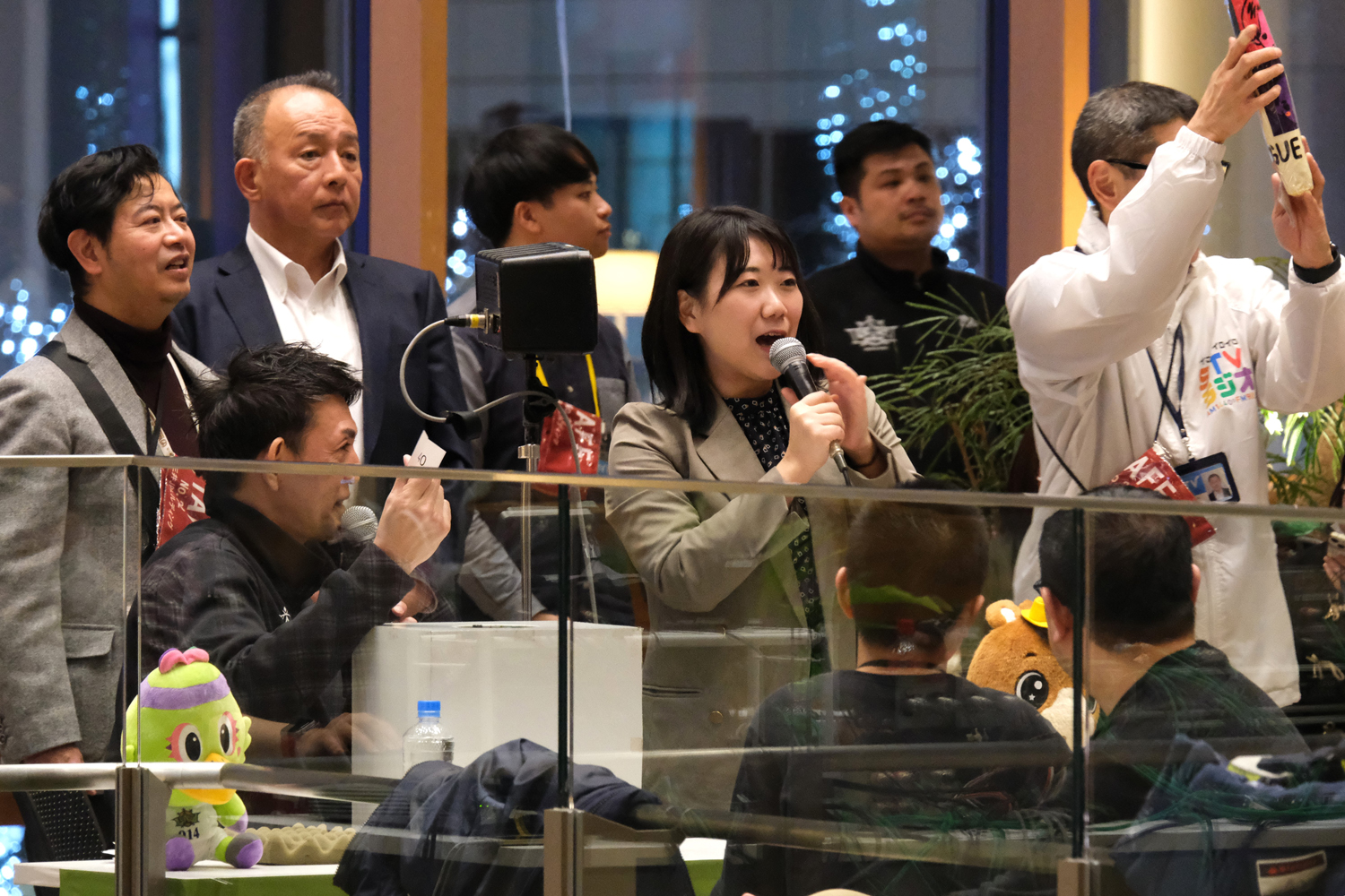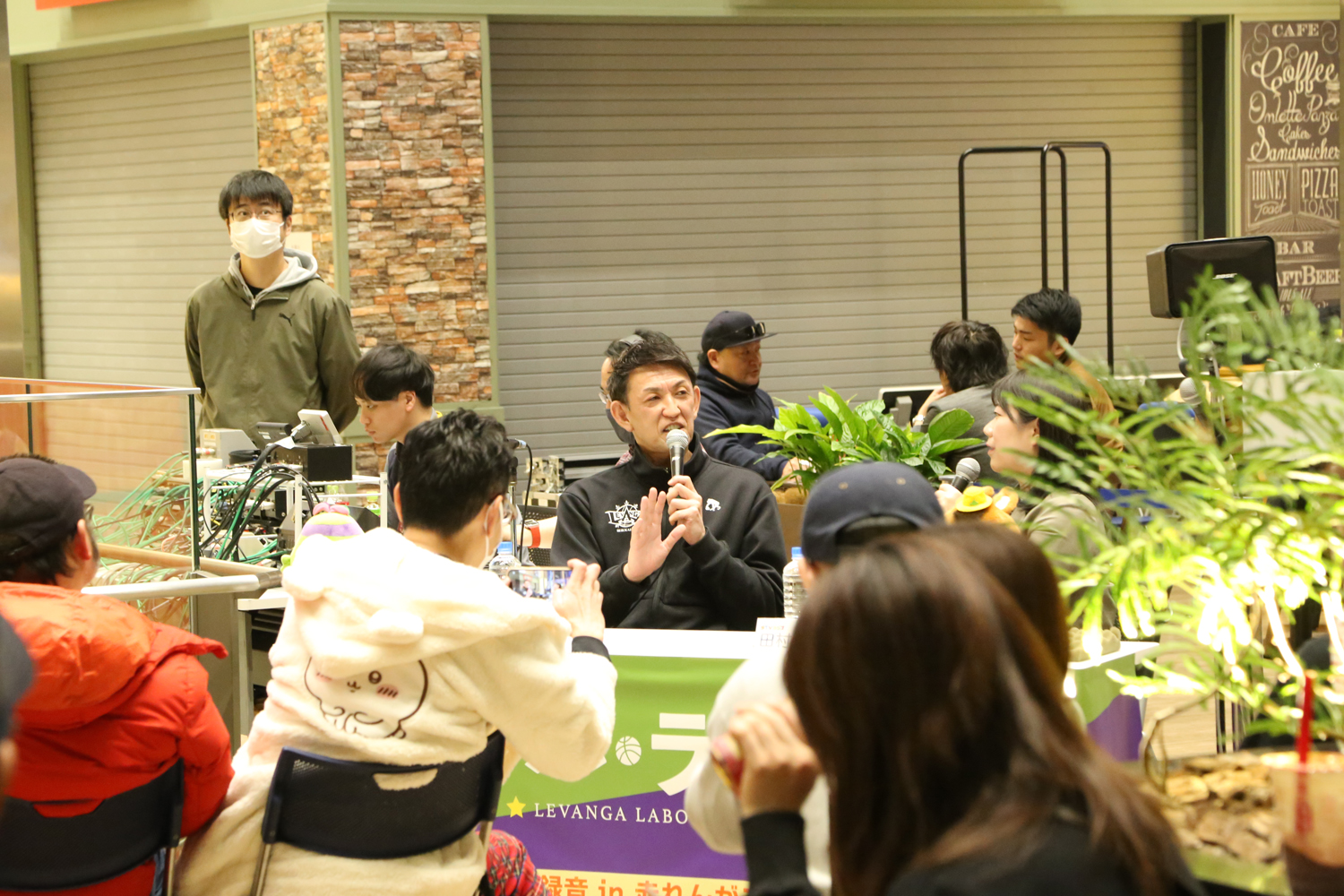 赤れんが テラス2階には200名近い観衆が集まり、すごい熱気となりました。会場にはレバンガ北海道の折茂武彦社長が登場して試合前には今期ここまでの戦況やチーム状況、ハーフタイムや試合後には当日の試合のよかった点や課題などの解説が行われました。来場された方々は、そのわかりやすいお話に感心しきり。