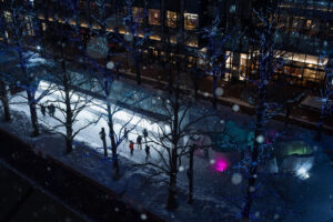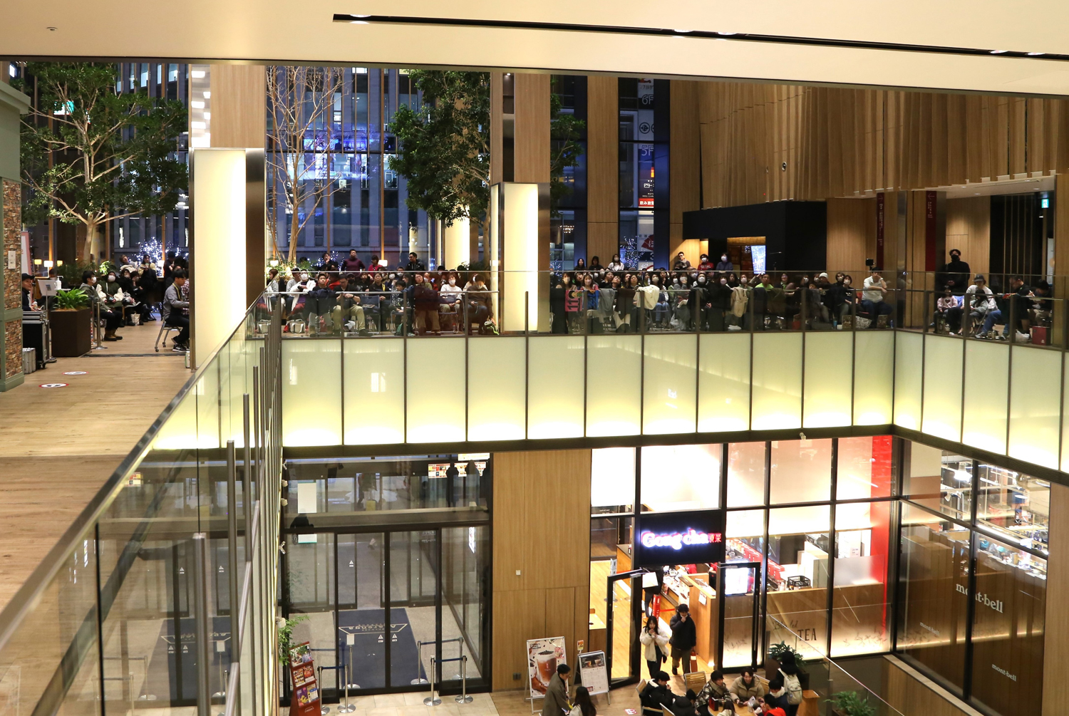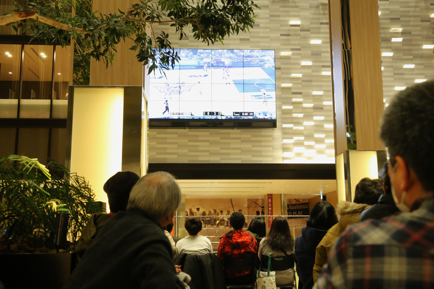 そこで、もっと身近に、まちなかでプロバスケットボールの迫力にふれてもらうため「赤れんが テラス」では年に数回、1~2階の吹き抜けに設置された大きなディスプレイを用いて無料のパブリックビューイングを実施しています。上の写真は2月11日に開催された琉球ゴールデンキングスとの一戦の様子です。
