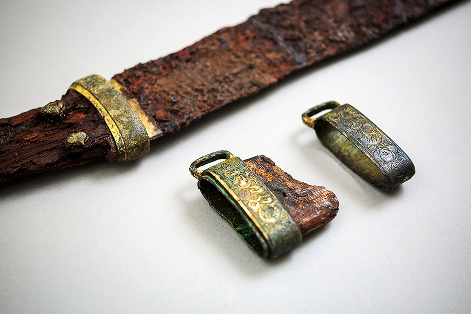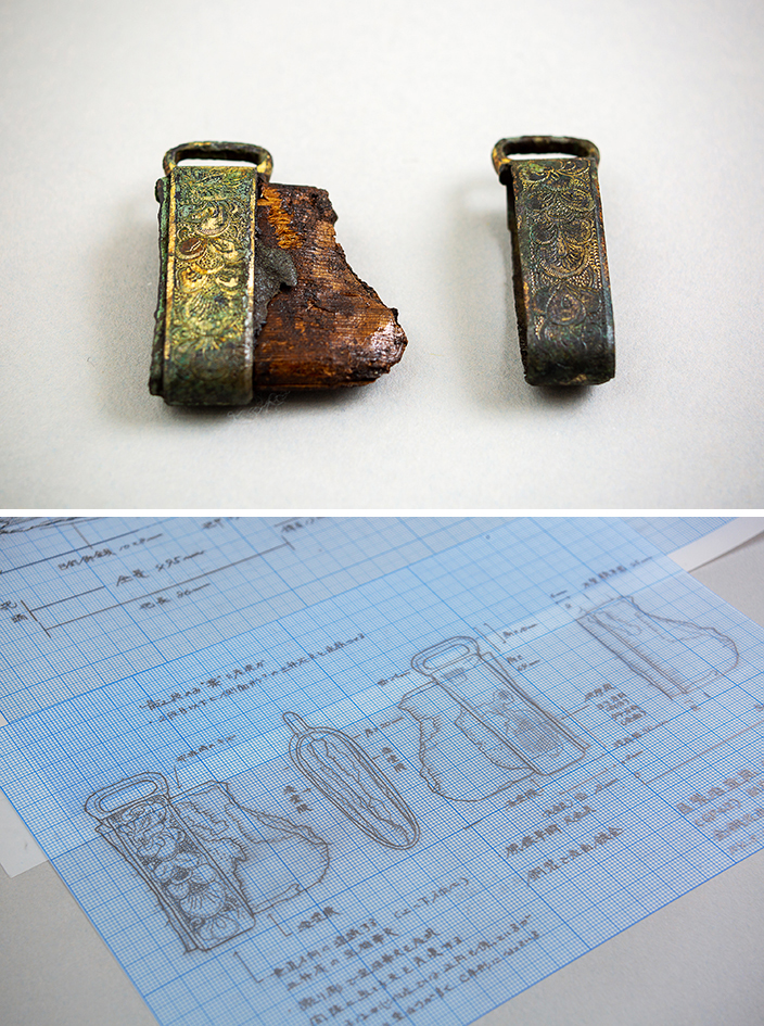 文様は、刀の鐔(つば)と、鞘(さや)に取り付け帯から吊るすための足金具(あしかなぐ)に彫り込まれている。これらは銅を金めっきした鍍金(ときん)で、当時はかなり高度な技術だった。さらに、鞘の表面には漆が塗られ、蒔絵(まきえ)がほどこされていた痕跡が見つかったという。今はすっかり朽ちているが、金と蒔絵に彩られた絢爛豪華な逸品だったと想像できる。