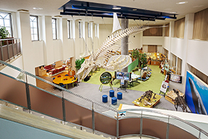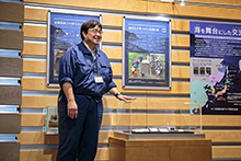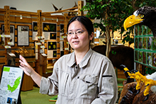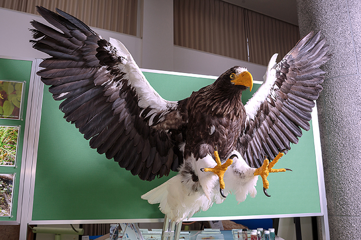 オオワシは、冬に大陸の極東沿岸やサハリンなどから1500羽ほどが北海道へ渡り、そのうち30〜50羽が枝幸にやってくる。館の剥製は翼を大きく広げ、鋭い爪で今にも掴みかかってきそうな迫力だ。この飛んでいるポーズには、生物担当で鳥類が専門の学芸員・立石淑恵(たていし よしえ)さんのこだわりが表れている。「日本最大のワシなので、翼を広げると大きさを実感できると考えました」。以前からある剥製は若鳥で小ぶりだったこともあり、町内で死体回収した体の大きなメスの成鳥を、躍動感ある姿に仕立ててもらったという。