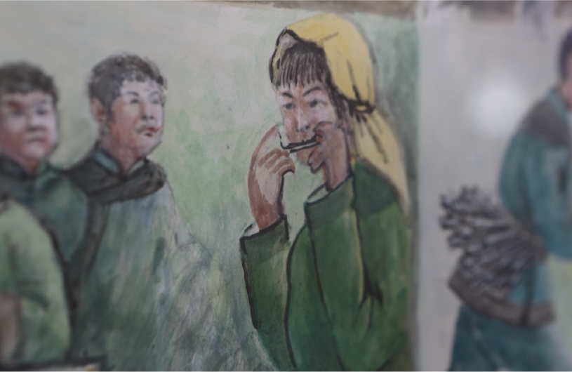 魚皮をなめすホーチャ族の絵